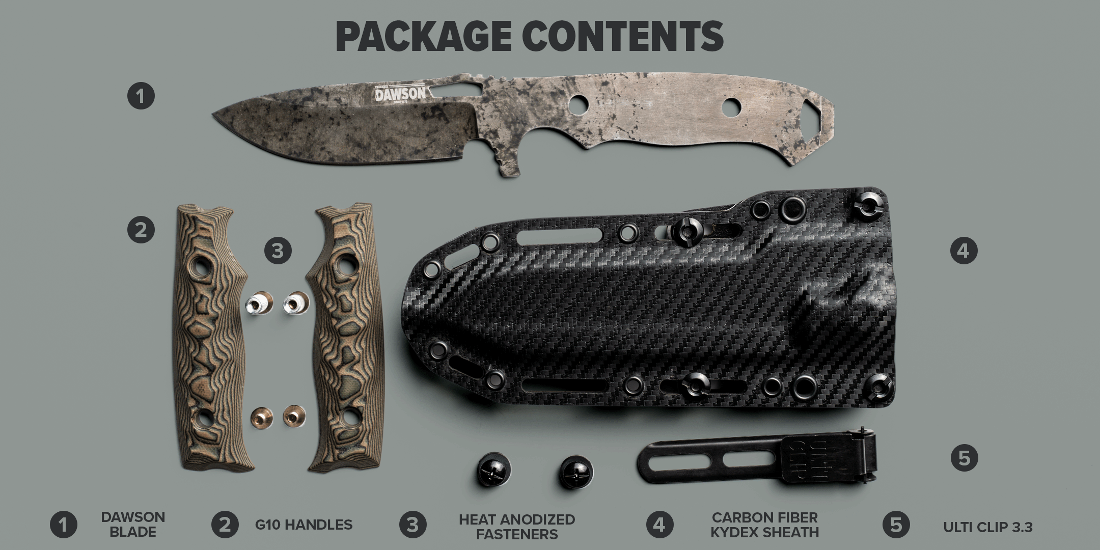 Our redesigned GEN 2 Carbon Fiber Kydex sheath features an improved rattle free fit can be carried horizontally, vertically, beltless and is MOLLE compatible.