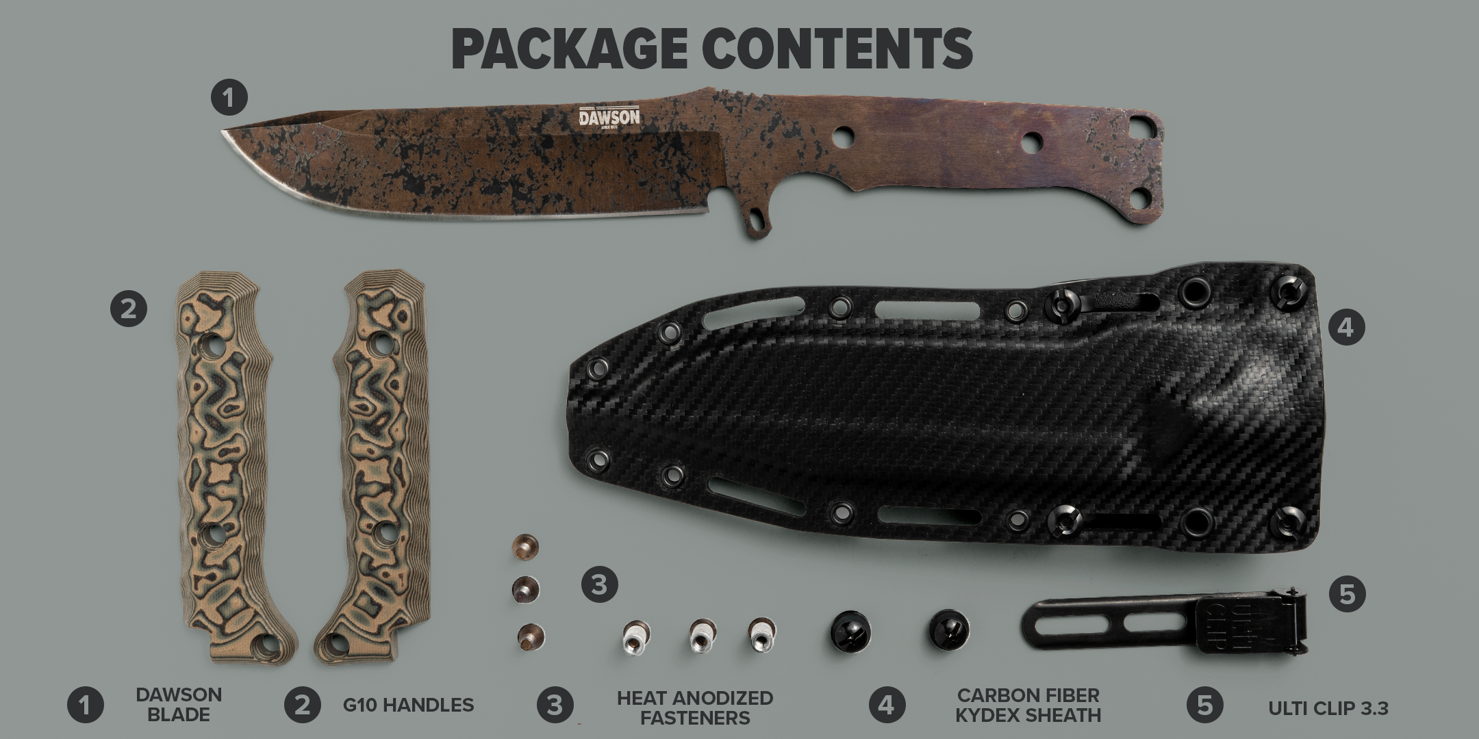 Our redesigned GEN 2 Carbon Fiber Kydex sheath features an improved rattle free fit can be carried horizontally, vertically, beltless and is MOLLE compatible.